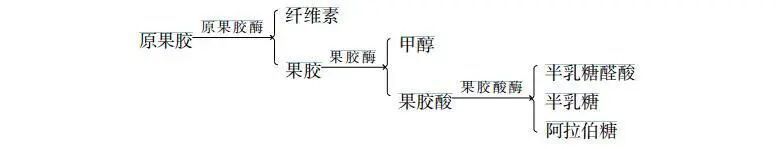 未成熟的水果中是原果胶,逐渐成熟后变成果胶,最后在水果后熟中,果胶被分解。