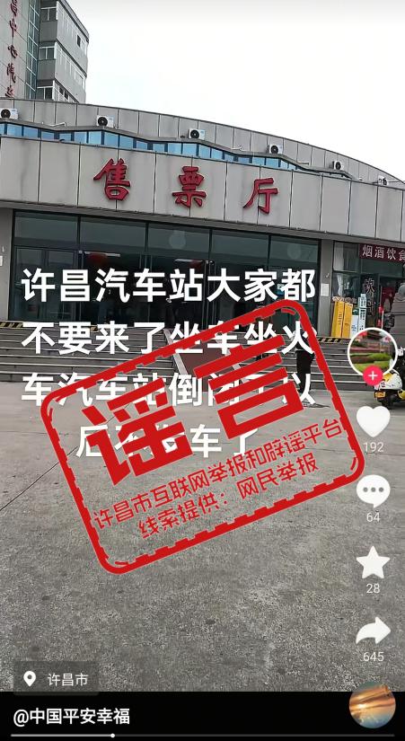 近日,某平台账号“@中国平安幸福”发布视频信息称“许昌汽车站大家都不要来了,坐车坐火车,汽车站倒闭了,以后不发车了”。经向市交通运输局核实,其发布视频信息位置为“许昌中心汽车站”,该站正常经营,不存在倒闭关停现象,视频信息为谣言。