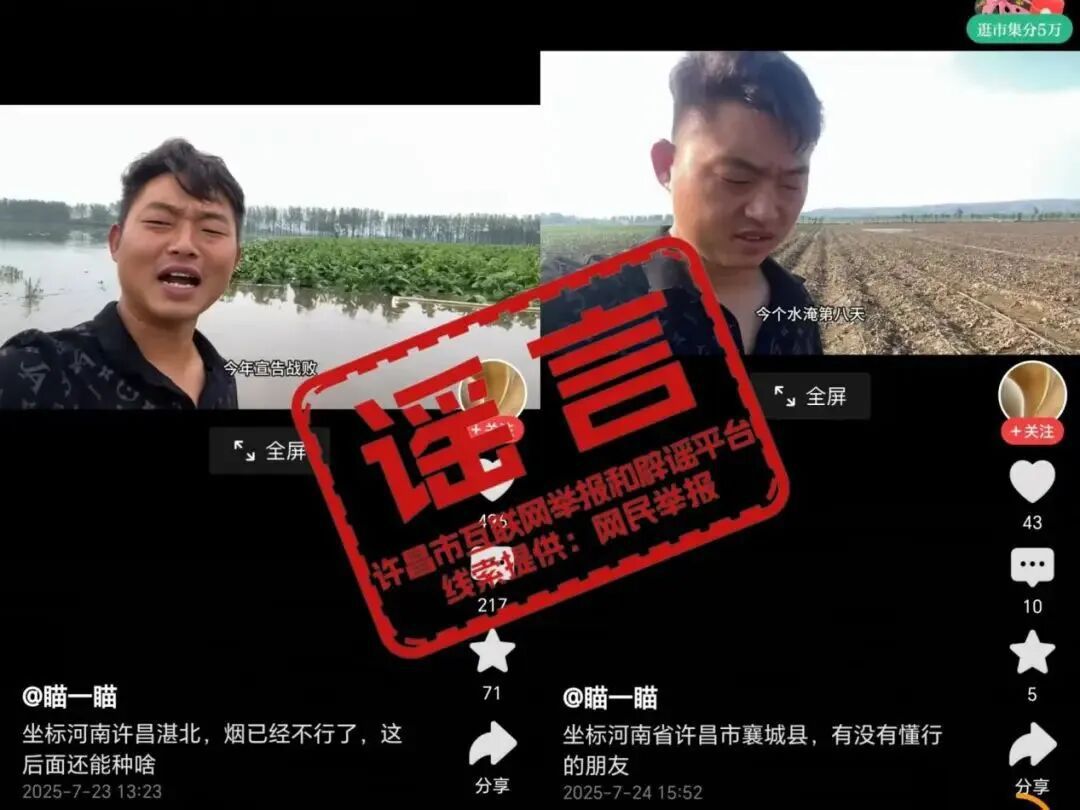 针对网传“许昌湛北农田被淹”的谣言,许昌市委网信办核查为往年旧闻翻炒的不实信息,及时进行辟谣,并将相关谣言线索纳入专项整治,强化网络巡查监测。